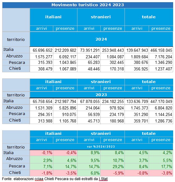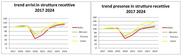 Nel confronto tra il 2024 ed il 2023 si rileva come, dopo la contrazione sofferta in tutta la movimentazione turistica durante il periodo pandemico, le variazioni positive degli arrivi continuino a Pescara sia sul versante interno che estero mentre a Chieti il dato continua a rimanere positivo solo con riguardo agli stranieri; dal lato presenze mentre a Pescara continua il trend positivo si segnala un dato in flessione a Chieti sia di turismo interno che estero.