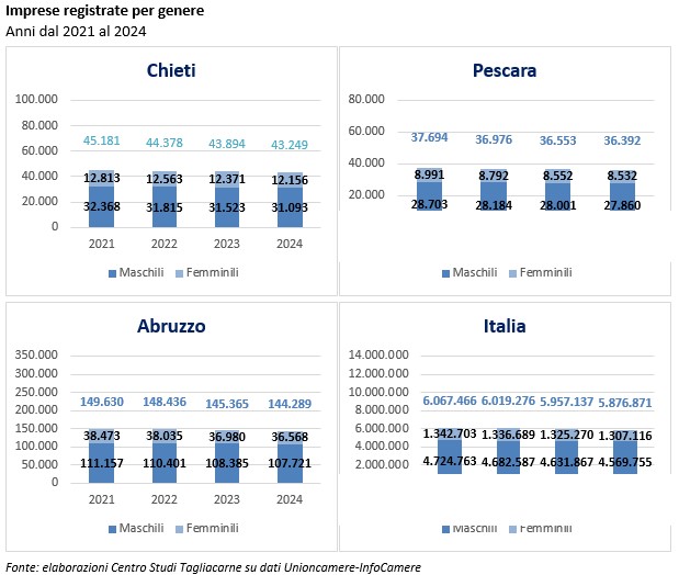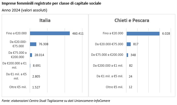 Nel 2024 a livello territoriale le società di capitali condotte da donne sono cresciute nella provincia di Chieti del +2,2% rispetto all’anno precedente, mentre la crescita avutasi nella provincia di Pescara è stata del +3,1%, al di sopra sia della media regionale (+2,8%) sia di quella nazionale (+2,2%).