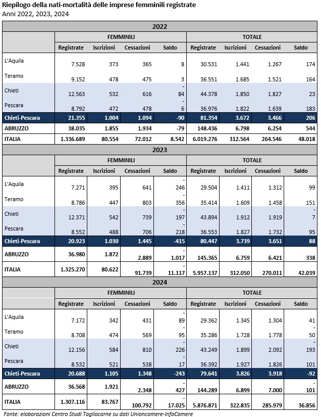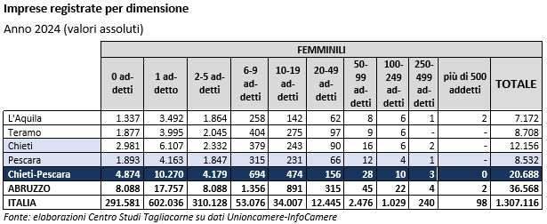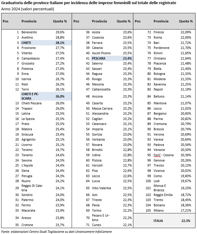 In tale contesto, il territorio delle province di Chieti e Pescara si caratterizza per un’interessante presenza di imprese femminili nel tessuto produttivo, in analogia con quanto si osserva in altri territori limitrofi, quali Benevento, Avellino, Frosinone e Isernia, delineando una vocazione economico-culturale caratteristica dell’Appennino centro meridionale che evidentemente va oltre le necessità di autoimpiego.