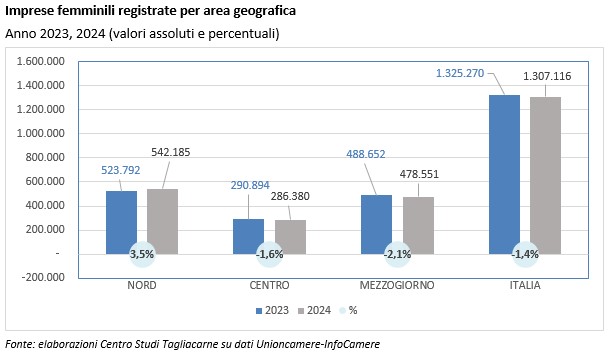 Anche nel 2024, nelle due province si registra un saldo negativo di imprese femminili, passando da -415 del 2023 a -243 dello scorso anno.