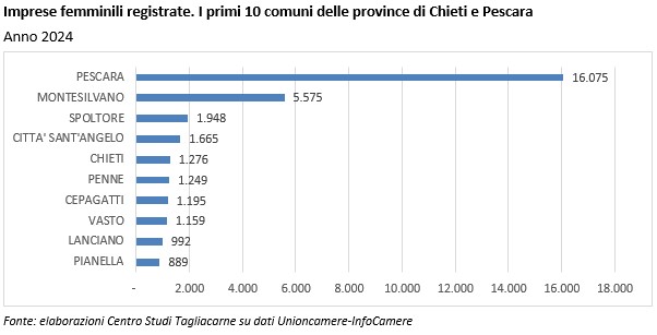La localizzazione delle imprese femminili evidenzia una marcata concentrazione nell’area metropolitana pescarese, dove Pescara si conferma nettamente al primo posto con 16.075 imprese registrate, seguita da Montesilvano (5.575), Spoltore (1.948), Città Sant’Angelo (1.665) e Penne (1.249). Tra i comuni della provincia di Chieti emergono Chieti (1.276), Vasto (1.159), Lanciano (992) e Ortona (721).