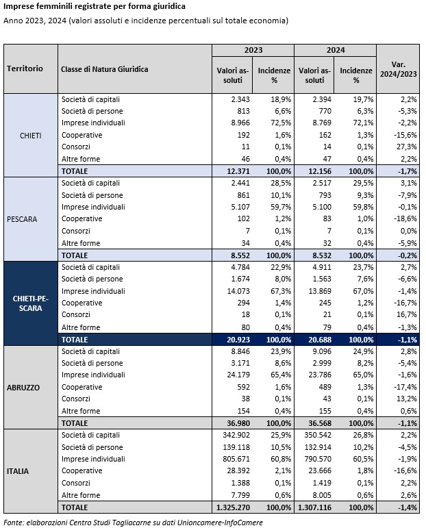 Dalla disaggregazione dei dati per forma giuridica, emerge come le ditte individuali rappresentino la componente numericamente più importante del sistema imprenditoriale. Il 67% delle imprese femminili registrate presso la Camera di commercio di Chieti-Pescara sono costituite infatti come ditte individuali; esse rappresentano il 72,1% delle imprese rosa della provincia di Chieti e il 59,8% di quelle della provincia di Pescara. Con il 67% delle imprese femminili costituite come ditte individuali, questa forma giuridica si conferma la più diffusa anche a livello regionale (65%) e nazionale (60,5%).