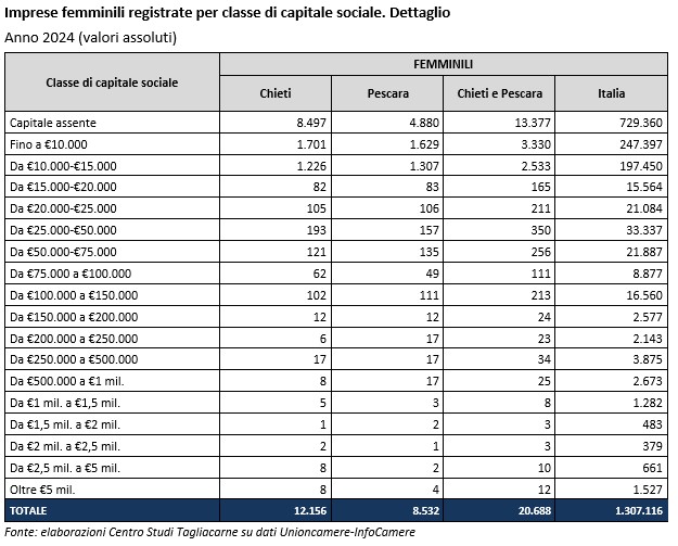 Il 67% delle imprese femminili registrate nelle due province di Chieti e Pescara sono costituite in forma di ditta individuale. Il dato è confermato dall’assenza di capitale sociale nel 64,7% dei casi, pari a 13.377 imprese (8.497 imprese a Chieti; 4.880 imprese a Pescara).