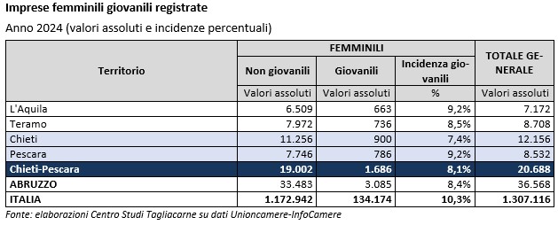 L’analisi in base all’età dell’imprenditore mostra che nelle province di Chieti e Pescara le imprese femminili guidate da giovani under 35 sono 1.686.