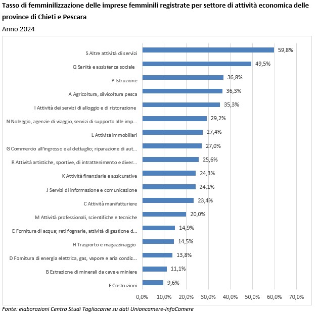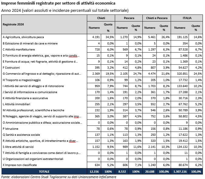 Delle 20.688 imprese femminili registrate presso la Camera di commercio di Chieti-Pescara, la categoria più numerosa si concentra nel settore agricolo, con 5.461 imprese, e nel commercio con 4.474. Seguono per numerosità le imprese impegnate nei servizi turistici con 1.703 imprese, le attività manifatturiere e le costruzioni rispettivamente con 1.297 e 807 imprese.